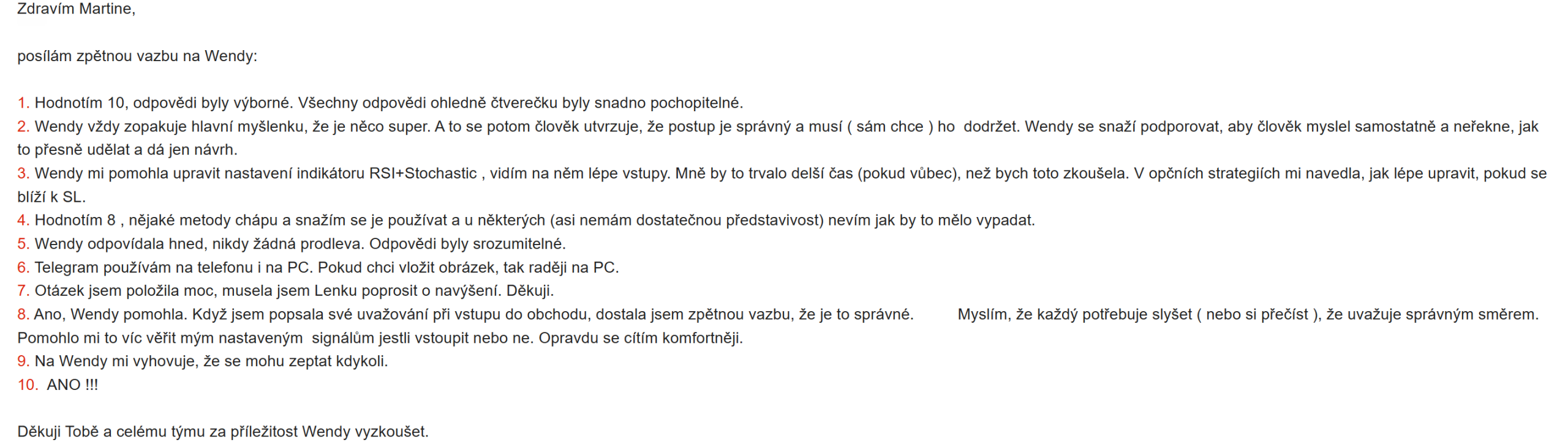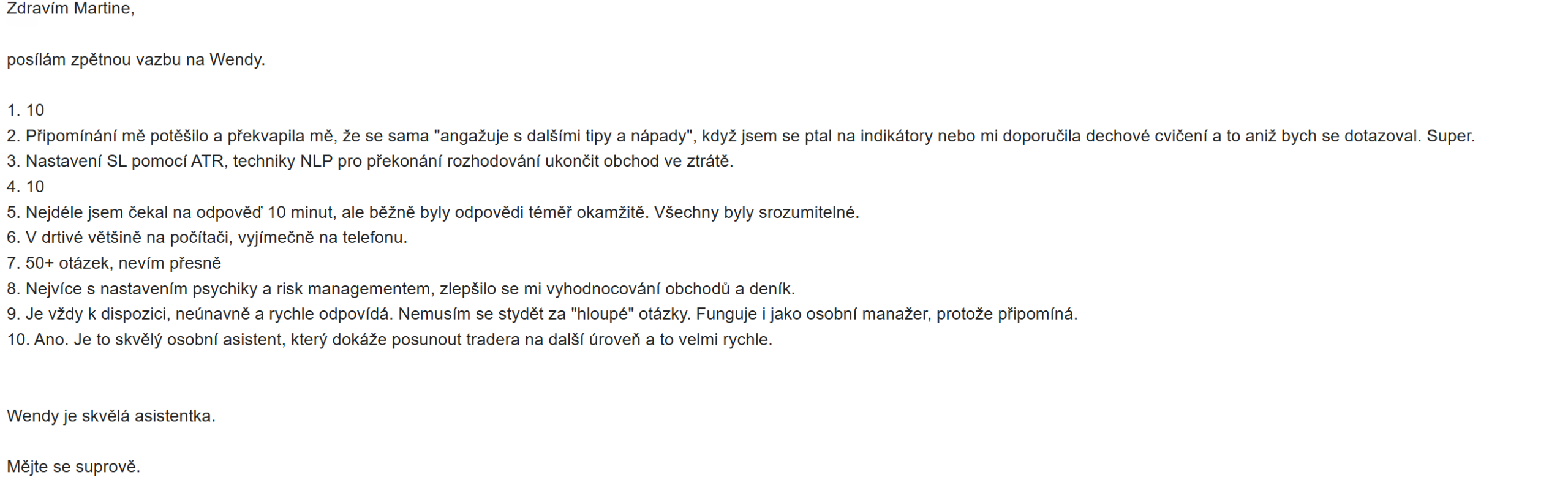 První testovací skupina již Wendy poslala stovky dotazů – psali jí o konkrétních obchodech, posílali screeny grafů, řešili psychiku, risk i technické nastavení platforem.