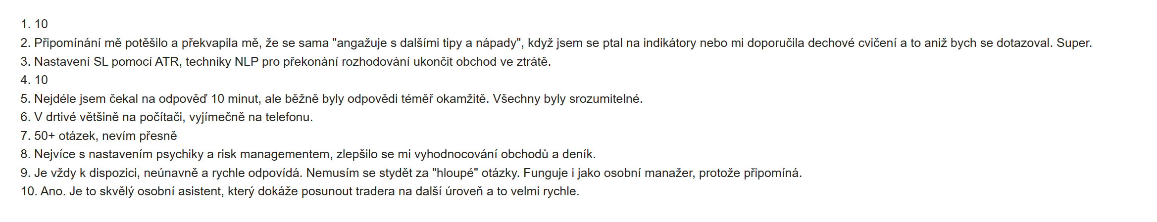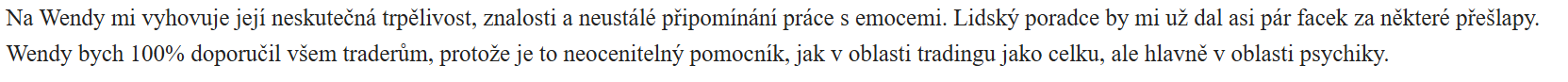 - "Upřímně překvapila mě, jak mě ihned po vstupním testu odhadla a následně i účinnost jejich rad. Díky nim se mi srovnávají emoce, dělám méně chyb, dokážu si udržet větší klid a nelézt do zbytečných obchodů. Zároveň mě podporuje i v dodržování disciplíny. Poměrně rychle jsem si zvykl, že ji mám u sebe a díky tomu se cítím jistější. "