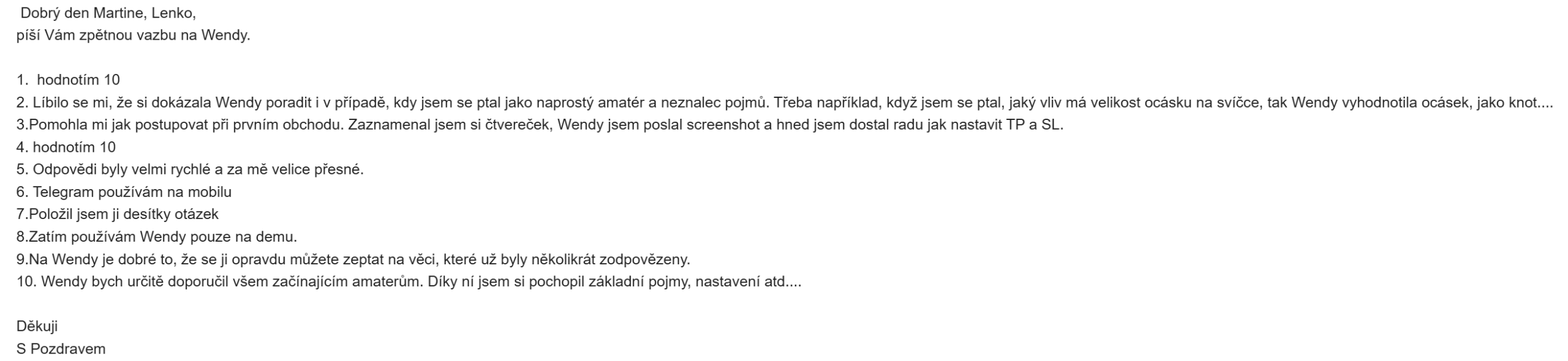 - "Líbilo se mi, že si dokázala Wendy poradit i v případě, kdy jsem se ptal jako naprostý amatér a neznalec pojmů"
