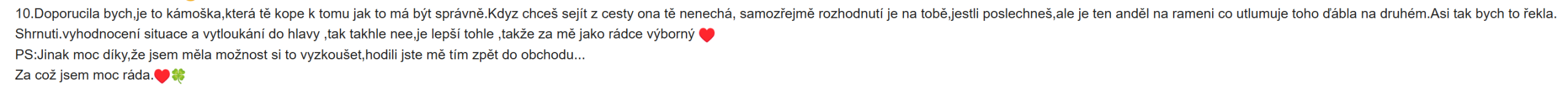 - "Je to kámoška,která tě kope k tomu jak to má být správně.Kdyz chceš sejít z cesty ona tě nenechá, samozřejmě rozhodnutí je na tobě, jestli poslechneš, ale je ten anděl na rameni co utlumuje toho ďábla na druhém."